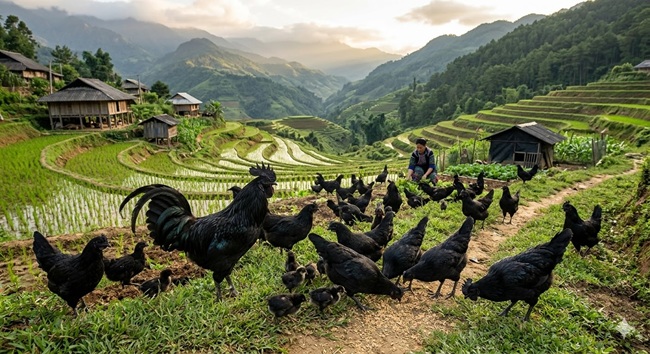 Gà H'Mông có nguồn gốc ở các vùng núi cao có đồng bào người H'Mông và các dân tộc tiểu số sinh sống. Giống gà H’Mông là giống gà quý hiếm, có đặc điểm là thịt đen, xương đen, hàm lượng mỡ trong thịt ít, thịt chắc và thơm ngon vào bậc nhất trong các giống gà ở Việt Nam hiện nay. Ngoài việc sử dụng làm thực phẩm, người tộc H’Mông còn nấu cao để bồi bổ sức khoẻ. Hiện nay gà H’Mông thương phẩm được coi là món ăn đặc sản.